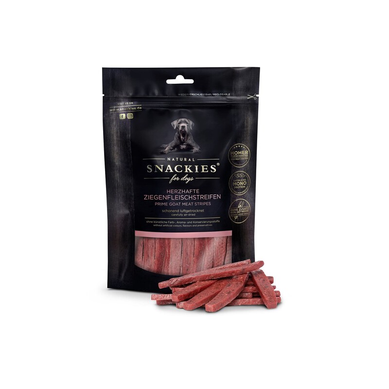 Finom, enyhén szárított kecskehús csíkok alacsony zsírtartalommal, mesterséges színezék, aroma vagy tartósítószer hozzáadása nélkül, hozzáadott cukor vagy gabona nélkül. Ezek a rágcsálnivalók finom ízűek, nagyon egészségesek és könnyen emészthetők. A visszazárható tasaknak köszönhetően sokáig frissek maradnak.