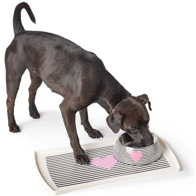 Modern dizájn a tiszta etetőhelyekért – a BIRI kisállat tál alátéttel a koszos padló és a kiömlött étel a múlté az etetőhely körül.