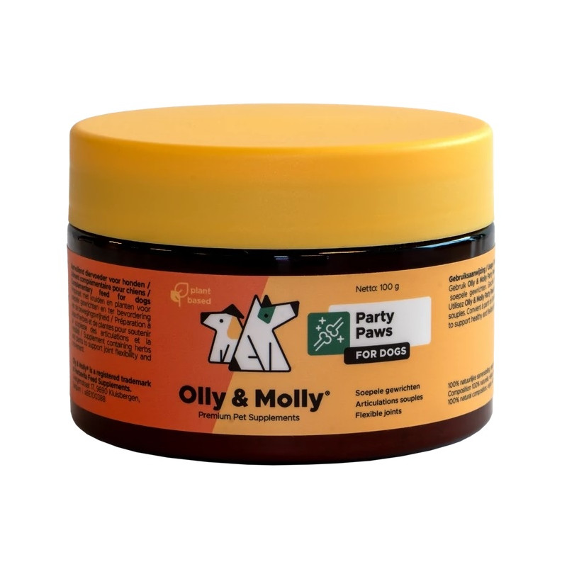 Az Olly & Molly Party Paws támogatja az egészséges és rugalmas ízületeket idősebb kutyáknál vagy merevség jeleit mutató kutyáknál.