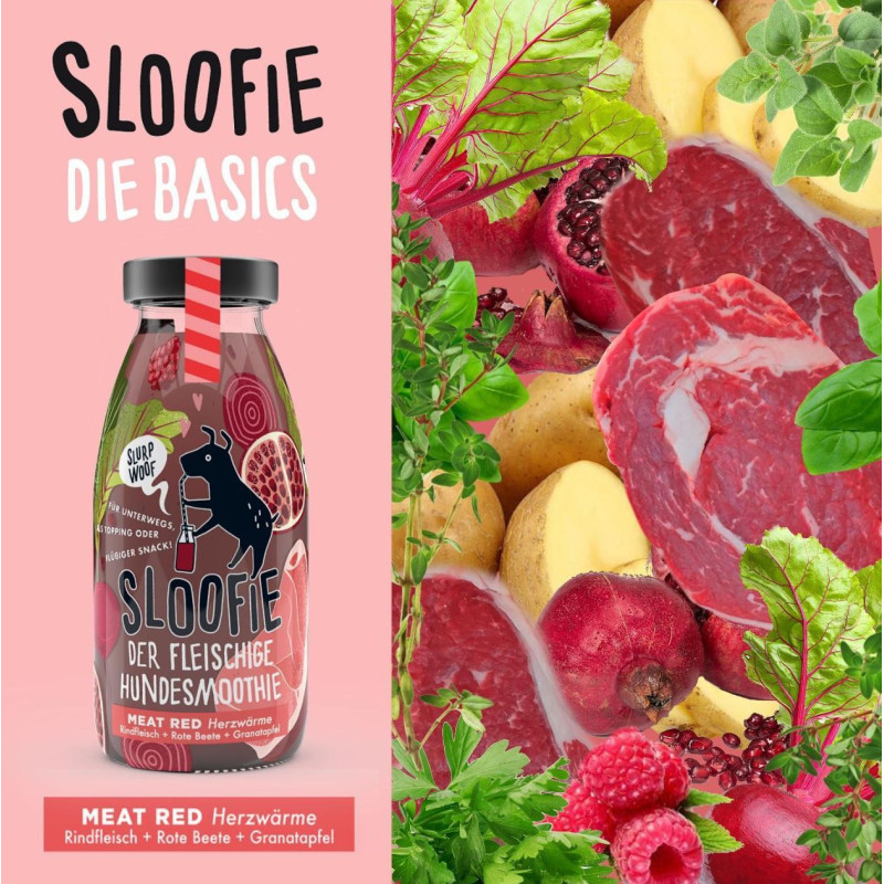 A MEAT RED monoprotein marhahúsból készült SLOOFIE, amely erőt, stabilitást és energiát ad a mindennapokhoz. A marhahús kiváló minőségű fehérjeforrás, gazdag vasban és B-vitaminokban, támogatja az izomműködést és a vérképzést. A cékla segíti a keringést és a sejtek oxigénellátását, a gránátalma és a málna antioxidánsai pedig védik a sejteket és erősítik az immunrendszert.
