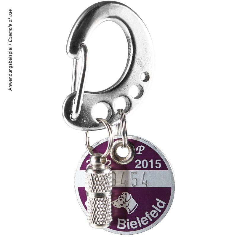 Egyeseknek idegesítőnek tűnhet a kutyabiléta halk csilingelése, míg másoknak egyszerűen csak az élmény része, és egyben arra is szolgál, hogy nyomon kövessék, hogy négylábú barátjuk a közelben van-e. Attól függően, hogy hol élsz, kötelező a kutyabiléta séták során magaddal vinned, és egy második címke, amely lehetővé teszi a kutya azonosítását és az azonnali kapcsolatfelvételt, általában jó ötlet. Eddig kényelmetlen volt, hogy a kutyabilétákat egyenként kellett cserélni, valahányszor nyakörvet, hámot vagy pórázt cseréltél. Mindig fennállt a körömtörés vagy a bőr becsípődésének veszélye is. Az EASY CHANGE dizájner karabiner olyan megoldást kínál, amely egyszerű és praktikus a mindennapi használatra. Akár négy különböző címke is rögzíthető a robusztus rozsdamentes acél karabinerre, és könnyen cserélhetők komplett szettként egyik kutyakiegészítőről a másikra. Az egyik nap egy valódi bőr pórázra vágysz, a következőn egy fényvisszaverő hámra, a hétvégén pedig feltűnő színkombinációban sétálhatsz a városban – az EASY CHANGE-nek köszönhetően ez már nem jelent gondot. Ha van valami, amire a kutyatulajdonosoknak feltétlenül szükségük van, az innovatív EASY CHANGE mindenképpen azok közé tartozik. Egyszerűen csak rögzítse – és már indulhat is!