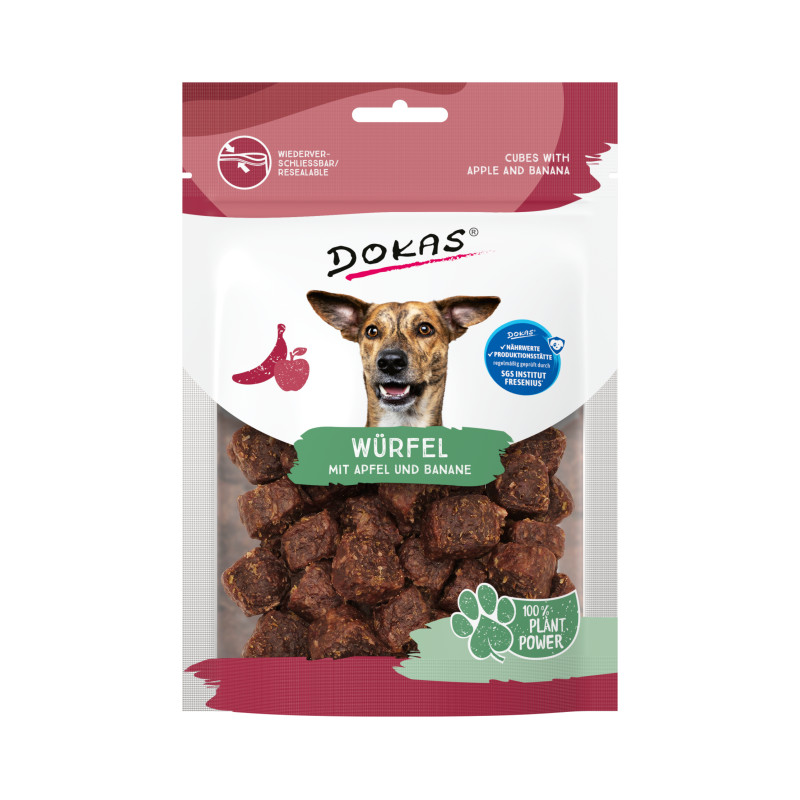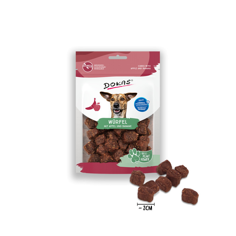 Húsmentes táplálékkiegészítő értékes összetevőkkel, például almával és banánnal az egészséges és kiegyensúlyozott étrendért.